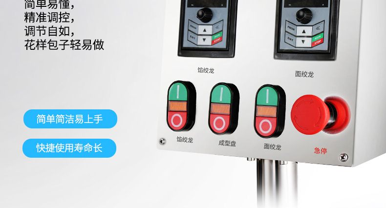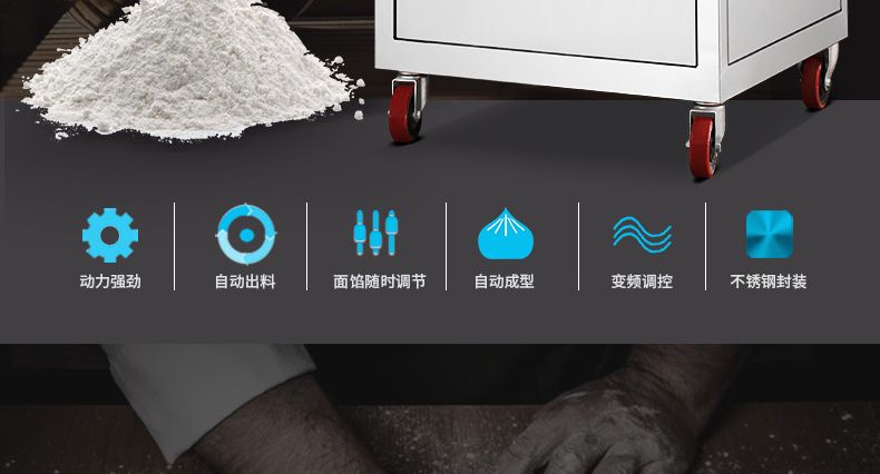 ◆ 本機采用雙絞龍送面、變頻無級調(diào)速,包子大小、出面出餡均可任意調(diào)節(jié),出面均勻、出面暢通、不傷面筋、不斷面筋,出餡系統(tǒng)優(yōu)點:餡管不會掉餡,不會出現(xiàn)空包子,出餡速度快,壓力小,均勻,適合各種不同的餡料。解決了普通包子機菜餡走不穩(wěn)的問題。