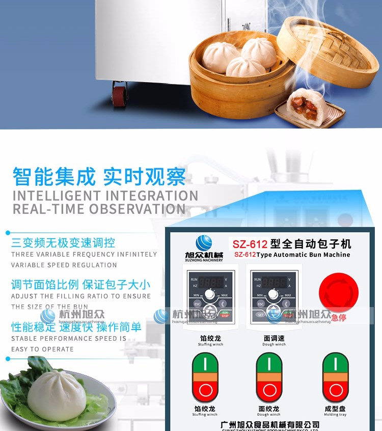 SZ-612型全自動包子機(jī)是一款設(shè)計(jì)先進(jìn),結(jié)構(gòu)簡單,操作方便,生產(chǎn)性能穩(wěn)定的設(shè)備。其體積小重量輕,外殼主要部件采用不銹鋼制作,外觀精美。
