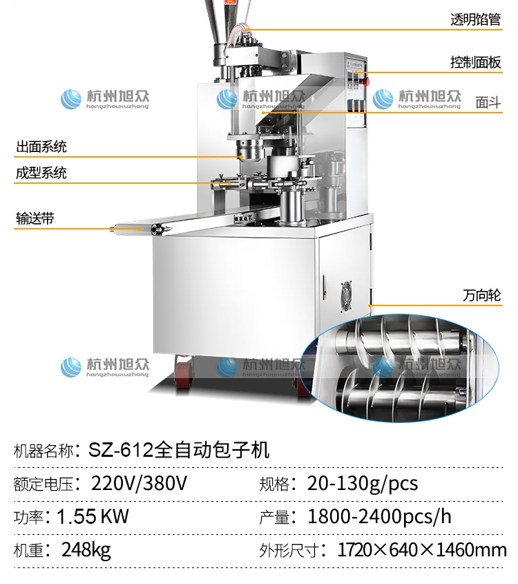 SZ-612全自動包子機(jī),22800元(不含運(yùn)費(fèi)不含稅價(jià)格),SZ-612型全自動包子機(jī)是一款設(shè)計(jì)先進(jìn),結(jié)構(gòu)簡單,操作方便,生產(chǎn)性能穩(wěn)定的設(shè)備。其體積小重量輕,外殼主要部件采用不銹鋼制作,外觀精美。