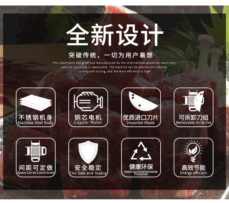 7.肉料可步進(jìn)進(jìn)料,可減少在切割過(guò)程中對(duì)產(chǎn)品的擠壓