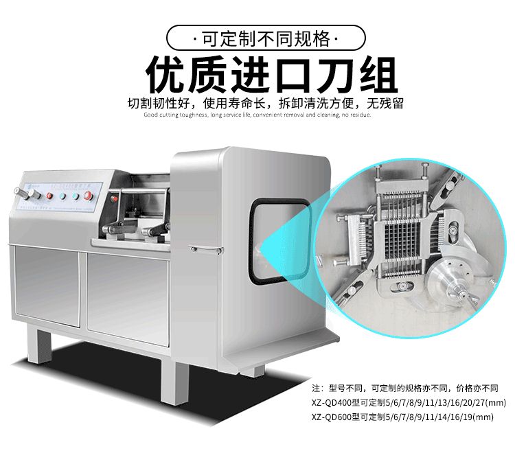 將肉塊、脂肪等主要原料,切割成用戶所需的肉丁,調(diào)整刀柵的尺寸可切出肉絲、肉片、肉丁。尺寸的大小,由刀柵中刀片數(shù)量來(lái)決定。