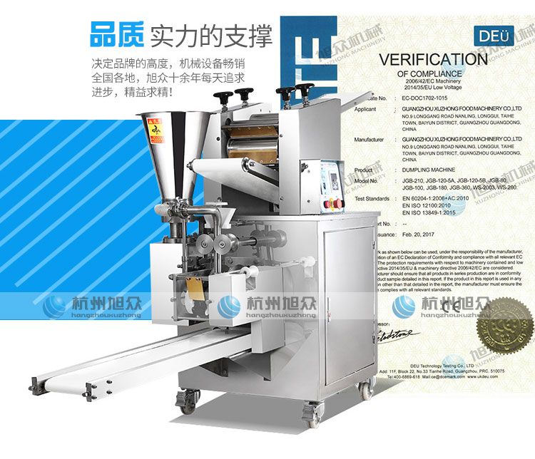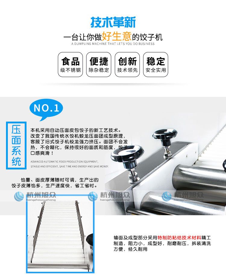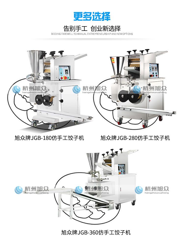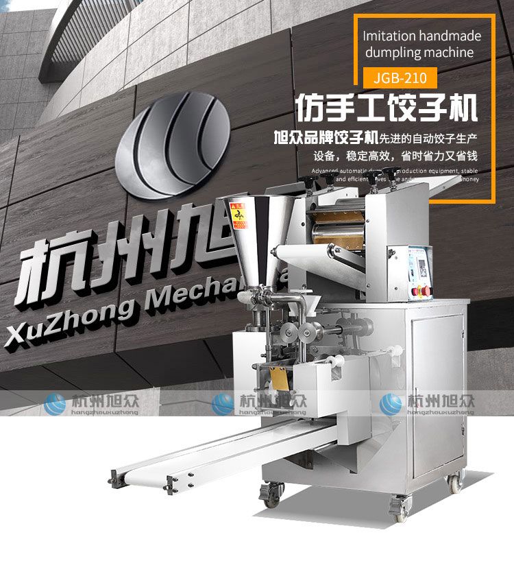 旭眾牌JGB-210型仿手工餃子機是我公司研發(fā)生產的先進自動餃子生產設備。本機采用自動壓面皮包餃子的新工藝技術,克服了舊式餃子機絞龍強力擠壓而帶來的對面筋的損傷,面團不會發(fā)熱,不會糊化,餃子口感佳。