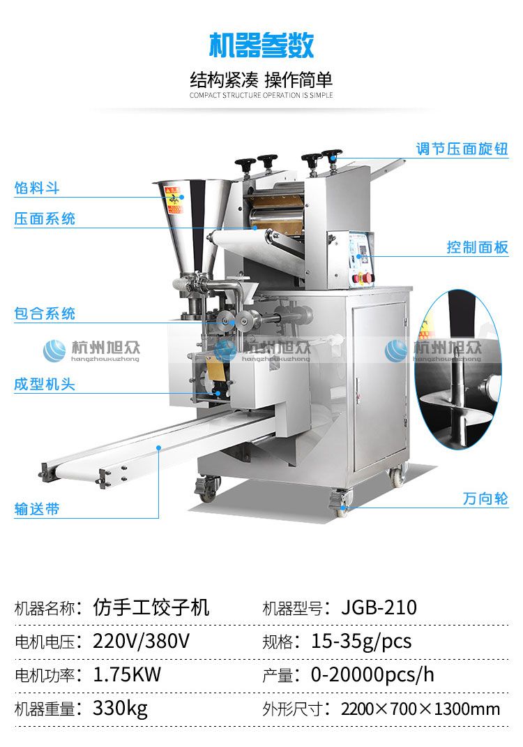 JGB-210型仿手工餃子機,本機采用自動壓面皮包餃子的新工藝技術,本機可生產速凍餃子等,能生產各種肉餡、肉菜混合餡、全菜餡及其他種餡的餃子,適用于餃子館、食品生產廠家、賓館、飯店、餐廳、團體食堂、學校、部隊。免費上門安裝調試,贈送面點工藝