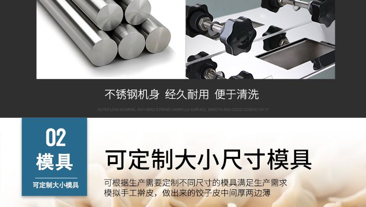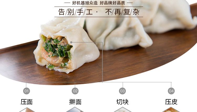 本機具有高效節(jié)能、安全衛(wèi)生、無邊角廢料、大小厚薄可定制等優(yōu)點,使所生產餃子皮在外觀、口感、重量達到空間統一,從而轉變了當今生產效率低、員工揮霍、二次污染、中部缺口等現狀,該仿手工餃子皮機除具有以上優(yōu)點外,還可依據生產必要轉變出皮速度等優(yōu)點。