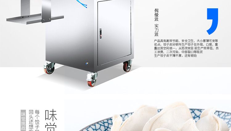JGB-90型餃子皮機(jī)是我公司開(kāi)發(fā)生產(chǎn)的先進(jìn)餃子皮生產(chǎn)設(shè)備??梢院?jiǎn)單更換模具(可根據(jù)客戶定制不同形狀、尺寸的模具),本設(shè)備采用氣缸運(yùn)動(dòng)。本廠生產(chǎn)的90餃子皮機(jī),采用多道壓面輥壓面,壓面效果優(yōu)異,壓出的面皮筋道,進(jìn)一步提高所包出的餃子口感。