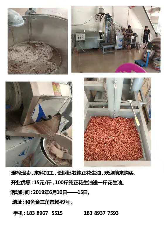 購(gòu)買旭眾榨油機(jī)的客戶新開(kāi)業(yè)做活動(dòng),有想加工的客戶可聯(lián)系他,或者想自己榨油加工創(chuàng)業(yè)的可聯(lián)系我們,了解榨油加工設(shè)備詳情:400-885-2117