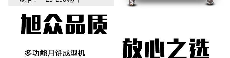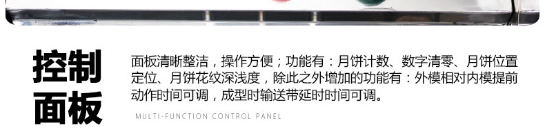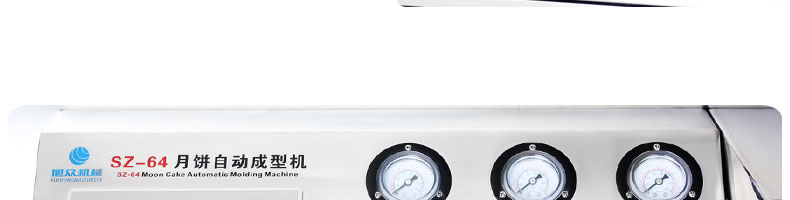 旭眾牌SZ-64型月餅自動(dòng)成型機(jī)是一款多功能的設(shè)備,其具備的功能有:月餅計(jì)數(shù)、數(shù)字清零、月餅位置定位、月餅花紋深度調(diào)節(jié)、外模對(duì)內(nèi)模提前動(dòng)作時(shí)間調(diào)節(jié)以及成型時(shí)輸送帶延時(shí)時(shí)間調(diào)節(jié)。